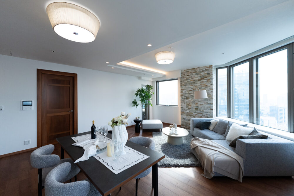 本住戸の主役は、約28.0畳の広さを誇る開放感あふれるリビング・ダイニング・キッチンです 。35階という高層階ならではの眺望は圧巻で、室内からは東京の象徴である「東京タワー」を一望できます 。