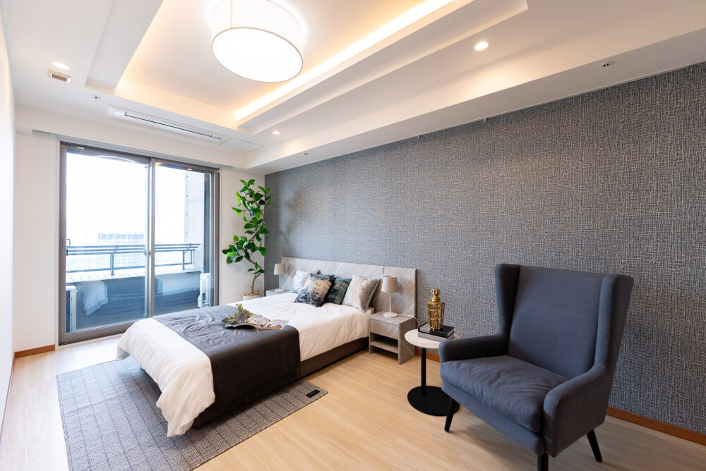 主寝室(約10.0帖): 最も広いベッドルームには、足元から温める床暖房を完備 。大型のWIC(ウォークインクローゼット)を併設しており、衣類や小物を美しく整理できます。