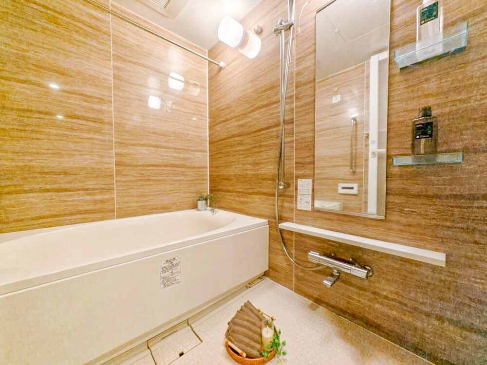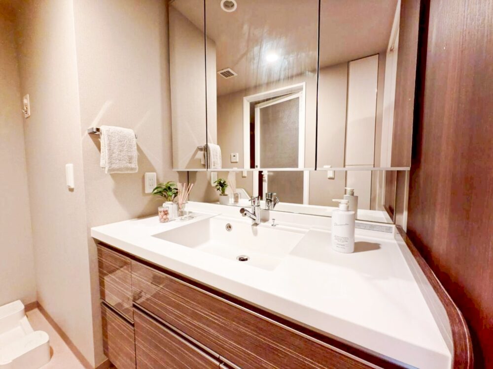 • 機能的な洗面化粧台: 三面鏡裏収納を備えた洗面台は、細かな洗面道具を隠して収納可能。リネン庫(タオル入れ)も併設されているため、お風呂上がりの動線が非常にスムーズです。