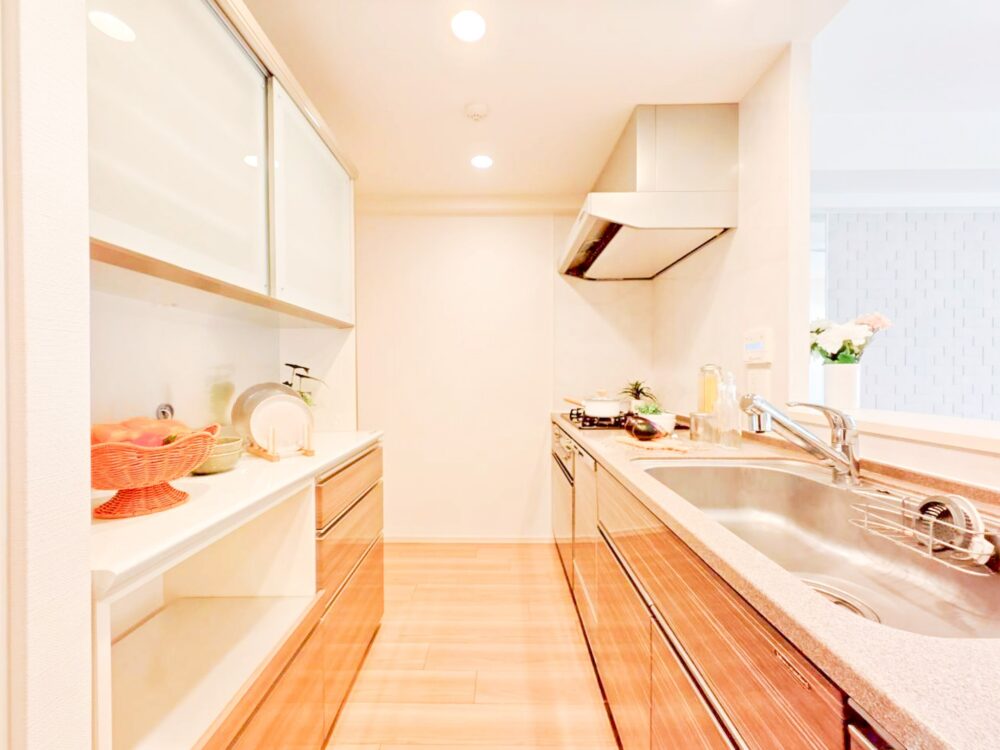 • 対面式カウンターキッチン: 料理をしながらリビング全体を見渡せる開放的な設計。キッチン横には物入があり、パントリー(食料庫)やゴミ箱の置き場としても重宝します。